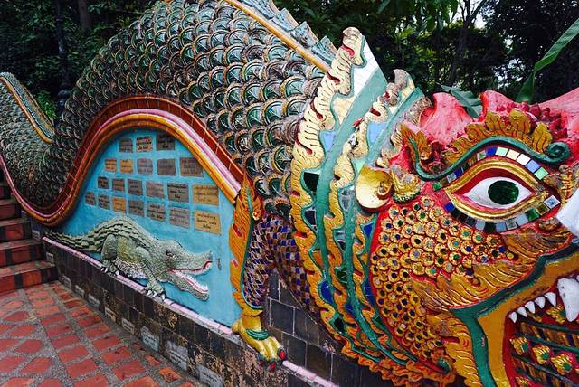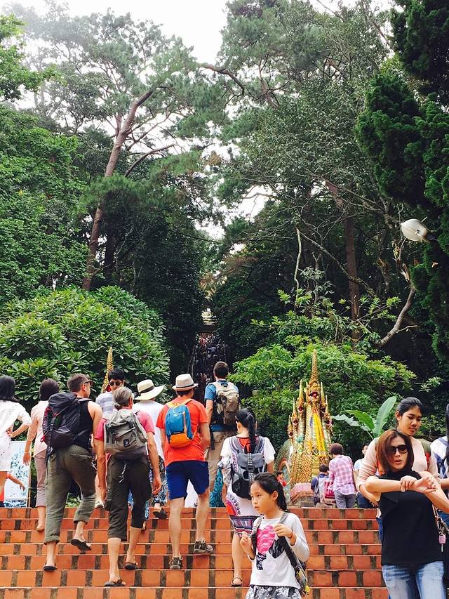 素帖山双龙寺(Wat Phra That Doi,Suthep วัดพระธาตุดอยสุเทพ)在素帖山上,因大殿下306级的长阶两侧有两条长龙,而被称为双龙寺。搭双条车从古城、清迈大学前门出发,30-50泰铢/人;专线双条上山,约40泰铢/人。上双龙寺的山路弯多陡峭,坐在车里有过山车的感觉。