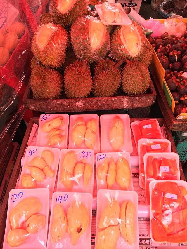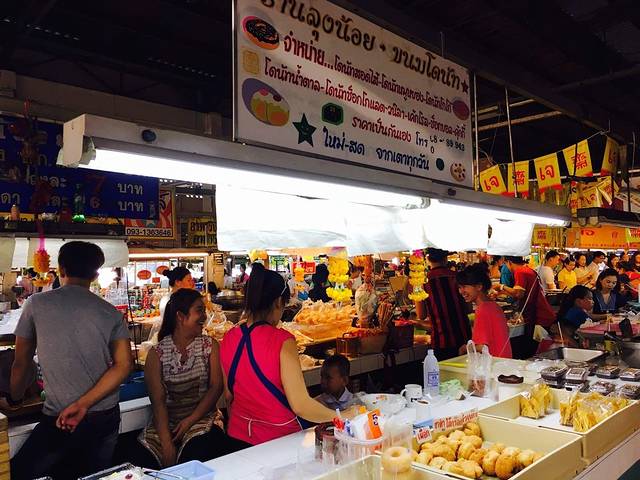 古城外不远的瓦洛洛市场,清迈的唐人街,建筑风格与曼谷的唐人街类似,多是红黄两色,大招牌上写的是中文。要想原汁原味体验本地人市井生活,这里绝对是首选。可以购买到各种水果、香料和可口的小吃,水果和特产都比古城便宜很多,种类也十分丰富,离开清迈前可来此选购特产。