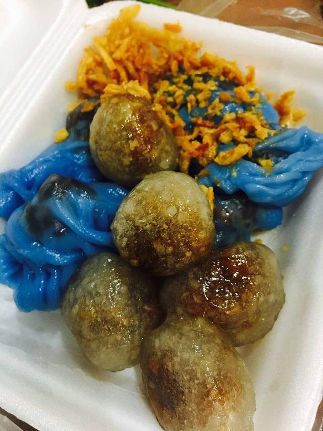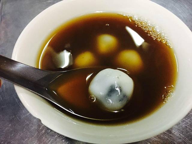 丸子的外皮Q弹十足,里面包裹着花生颗粒,而蓝色的像云吞的就吃不出是啥了,不太好吃。