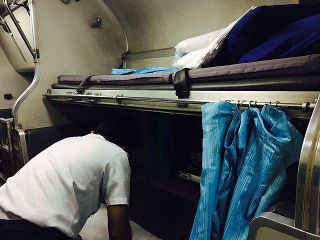 可坐四个人的座位,睡觉时,由列车员放下,就是上下2张约1.2米的带软垫的床。因为只有两层,所以上铺的空间比国内的舒服很多,每个床铺都配上还密封好的被子和枕巾,夜晚卧铺都放下时,帘子一拉,就是一个个单独包间,有软卧的赶脚。