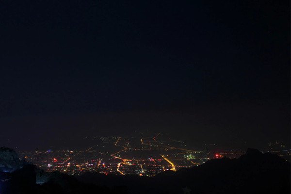 晚上六点醒来,估摸着这会儿应该快日落吧,赶紧就跑了出去。泰山的美并不仅仅因为他的日出,如此的高度观观日落也是大好的风光。日落月升,斗转星移,此时的泰山之巅日月正同辉。看着最后一抹夕霞消失在地平线上,风也渐渐的刮了起来,回到宾馆去餐厅吃了晚餐,色香味可谓是一样都没占,但特殊的地理位置也就不要求那么多了。泰山的夜景受近年来雾霾的影响,星空并不是很明显了,泰山脚下的泰安市,虽不及北京那如同电路板一样的夜色,但也充满了活力。山间不时能看到闪烁的光亮,那是夜爬的人在向着玉皇顶进发,加油,我们明天日出时见。