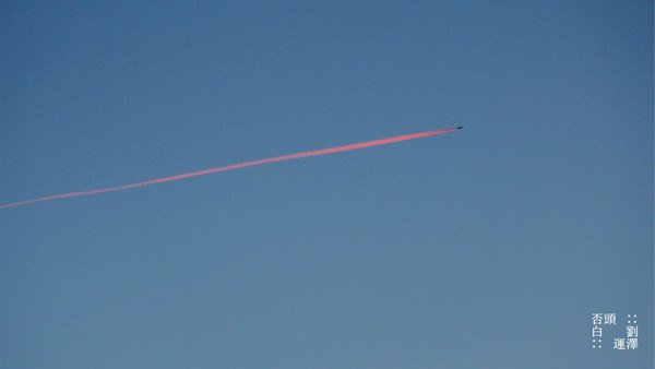 一架飞机迎着朝阳飞跃泰山上空,留下的轨迹也被朝阳的光芒浸染成了火红