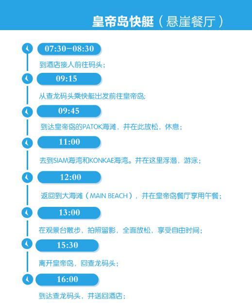 第一个:皇帝岛一日游,包含悬崖餐厅的午餐,138人民币/人,另小费100B/人