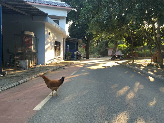 看阳光透过树缝在地上作画,看走地鸡在草丛里自在觅食,一切都如此美好。