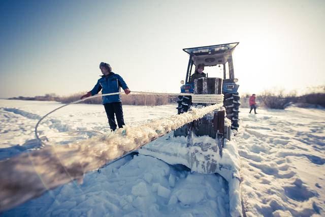 每年12月下旬到春节前的一段时间,是渔民进行大规模冬季捕鱼的黄金期,五大连池火山堰塞湖的冬捕尤为壮观,照片是起网前的准备阶段以及个别的用具。这种渔猎文化自从有人类在这里繁衍生息就已经开始了,照片中可以理解冬季捕鱼是有利于保存和运输的天然优势,所以这个古老的习俗一直延续至今。