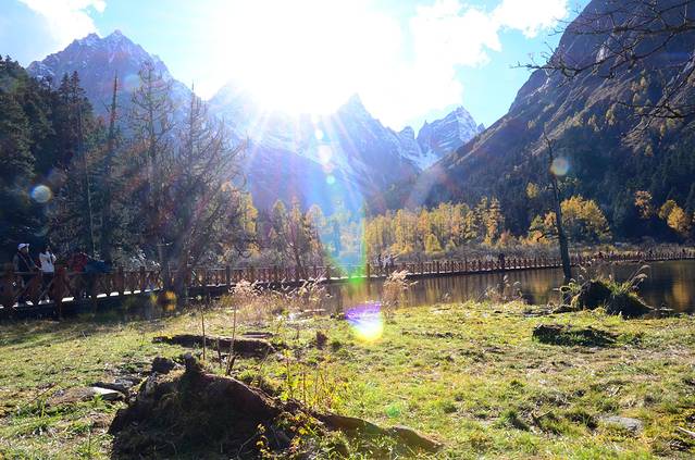 阳光很美、湖光山色,倒影把山和树映的别致;