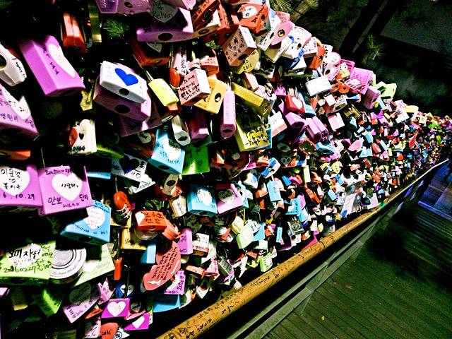 * 在去完N首尔塔回酒店的地铁上,我不经意的一个右转头,发现隔着十米的另一头有对熟悉的情侣(片段倒回前一天晚上:在一家精品店,她对一个门口的工作人员说里面的收营员 very impolite)意外的是我们居然真的同一个站下车,于是我就和来自香港的工程师和英语老师一路聊着去换乘。那是他们见我的的第一面,却是我见他们的第二面,或许,我们还会在香港见第三面呢……