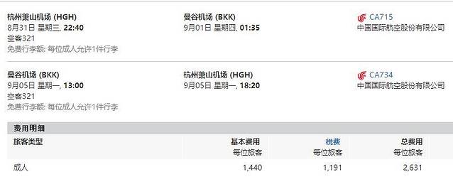 杭州往返曼谷,直飞仅国航和亚航(邻近的上海出发,春秋航班也很多)。注意亚航是廉航,需另买行李,无法退改签,对比后在国航官网买的,含税2631/人,含20kg行李,和同时段亚航价格相差不多。P.S.亚航起降在DMK廊曼机场,是旧的曼谷机场;国航起降在BKK素万那普机场,设施较新交通也相对方便。