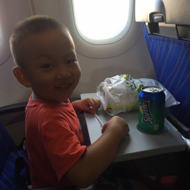 飞机上也是很兴奋的,不光孩子兴奋,妈妈也开启了自拍模式