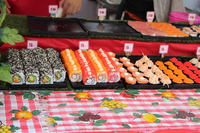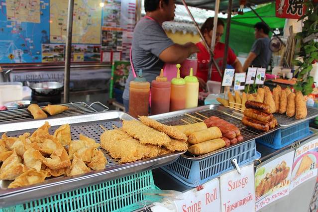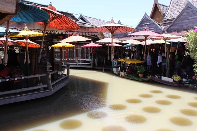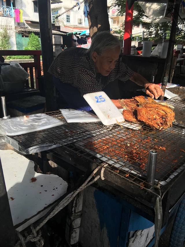 因为是水上市场,有很多小船停靠在栈道边,现烤现卖各种小吃。保留了泰国小商贩最质朴的贩卖商品的方式,用自己的小船作为店铺,免去了租金也节约了成本。如果你饿了可以随便吆喝他们一下,小船就会停靠在你身边。你可以尝试不同口味的泰国小吃和水果