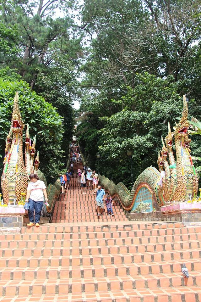 找了个突突车拼车去素贴山双龙寺,门票30泰铢。寺庙建在高台上,要从寺前的300多级台阶走上去,台阶两旁的栏杆是两条几十米长的彩色多头神龙,造型奇特。寺中金碧辉煌的佛像、贴满金箔的舍利塔等都是很值得一看的景观。