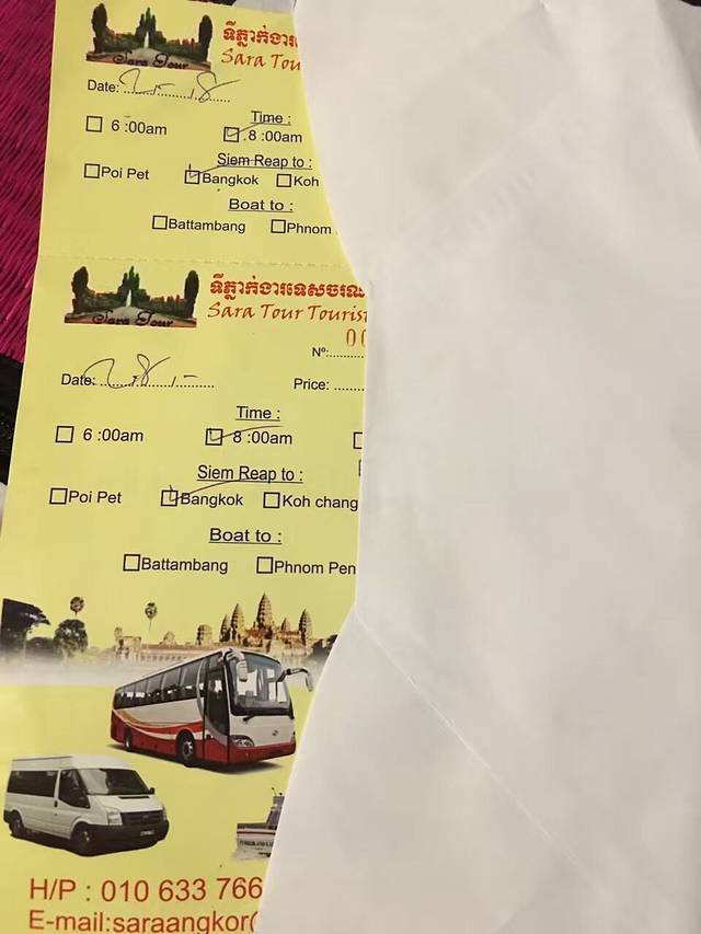 在暹粒的最后一天,从崩密列回来,找到一家旅行社,距离青旅不远,在门口的牌子上看到有发往曼谷的汽车,进去买票很顺利,手舞足蹈了一会儿就解决了,确定了发车时间,工作人员在纸上写了很多个7:30,她不确定我看不看得懂,一定要在这个时间在酒店门口等,我点头多次,我懂了,最后她又留下电话号让我可以打电话给她。