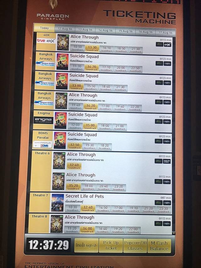 去看了场电影,选了好久的片子,最终决定看爱丽丝梦游仙境,票价250泰铢,泰语我听不懂,英文字母也看不懂,我就是看热闹的、哈哈。自助购票好像便宜一下,但是看了好久不会操作,还是放弃了。