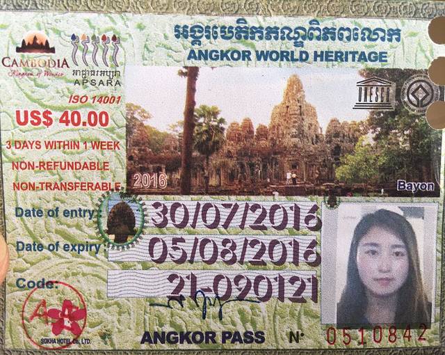 门票:吴哥窟的门票分三种:一日票20美元;三日票40美元,可以选择连续三天或一周内任意三天参观;七日票60美元,可以选择连续七天或一个月内任意七天。买票时当场拍照,照片会印在自己的门票上。