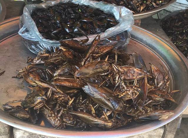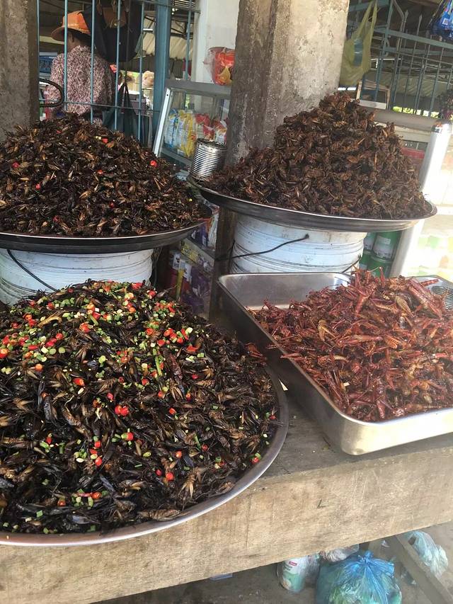 停车休息,在路边都是这些个昆虫,我不想吃昆虫,一个柬埔寨女孩,骑着摩托车在路边停下,抓了几只就开始吃貌似觉得味道好,买了一袋、一边吃一边看我笑、你是几个意思?