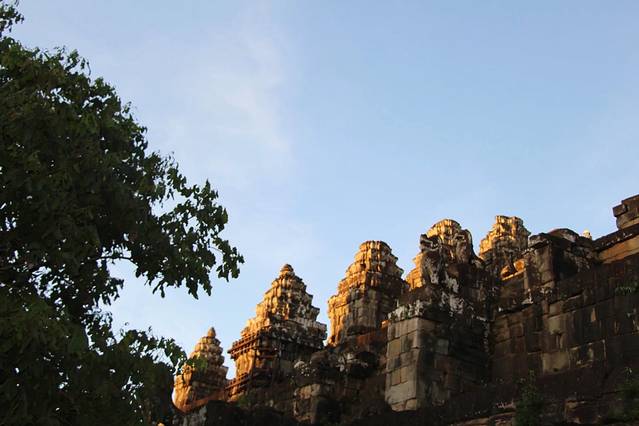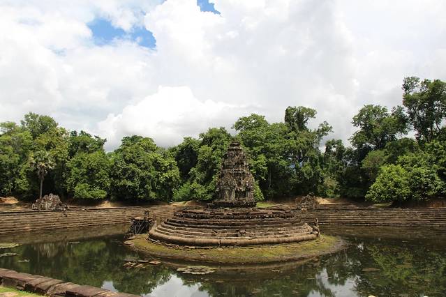 皇家浴池是举行沐浴仪式的场所,水池中央曾经有一座木质的寺庙,现在只剩有石基。这里是看日出的最佳地点之一,人没有吴哥寺那么多,朝阳映着静静的池水升起,景色迷人。