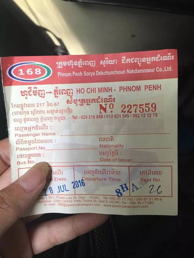 在胡志明买了去柬埔寨金边的车票、票价和人民币84元、由于不懂英语,和青旅的工作人员手舞足蹈了半个多小时,一直担心自己被卖掉,一大早,青旅门口来了一辆摩托车接我,胆战心惊的坐上车,一直送到大巴车上,还是担心自己被卖掉,把车票拍下来发给老爸,然后…漫长的等待,终于发车了