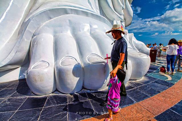 远远看到观音时真的是美呆了,因为正好有一圈云环绕着观音的脚下,感觉真的是腾云驾雾,多么想掏出相机来几张,二老婆一个劲的提醒我,不能照观音,有忌讳!!好吧好吧,只能把那么美的画面深深刻画在脑海里了!