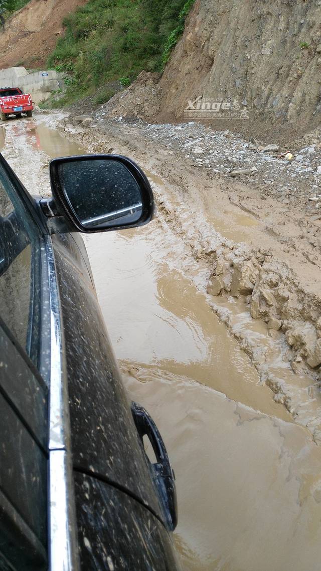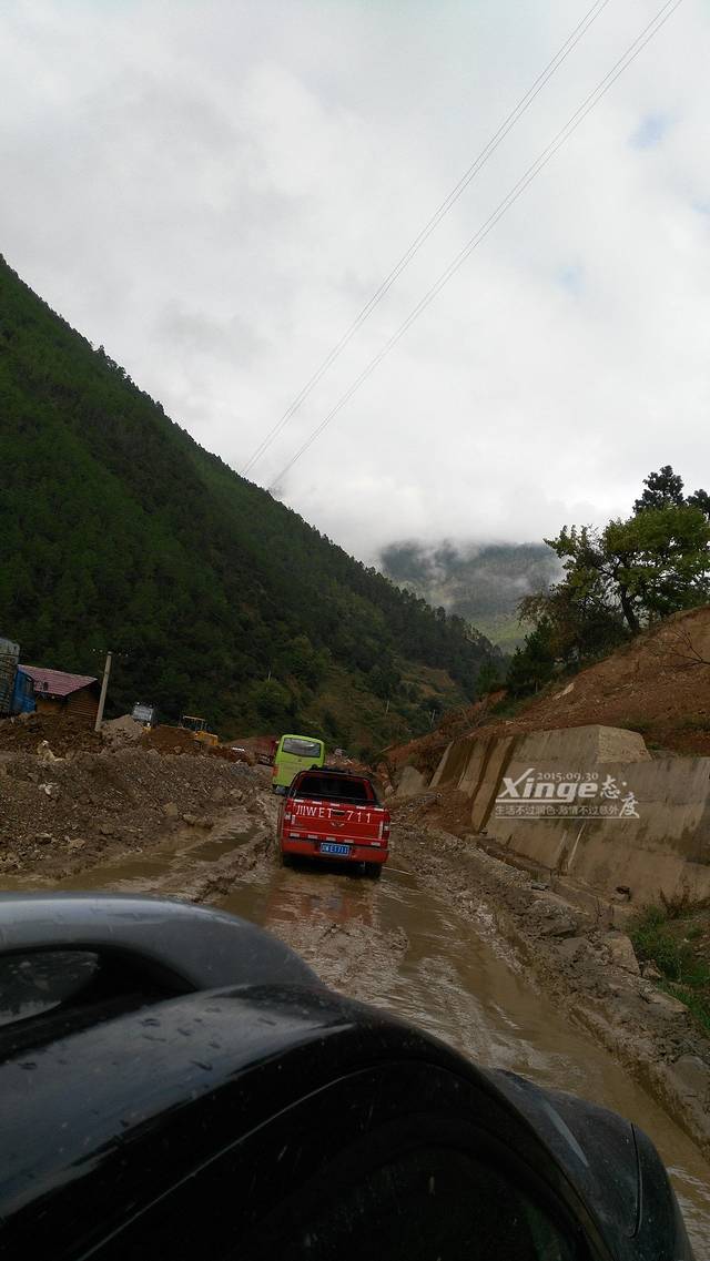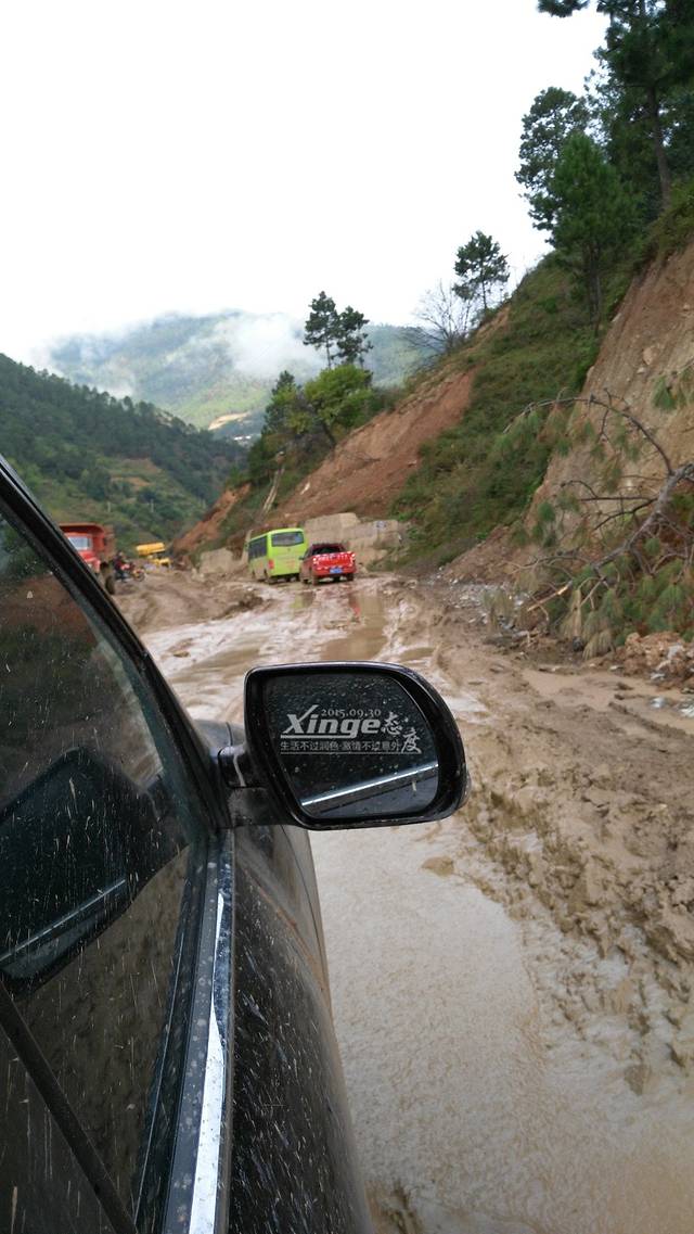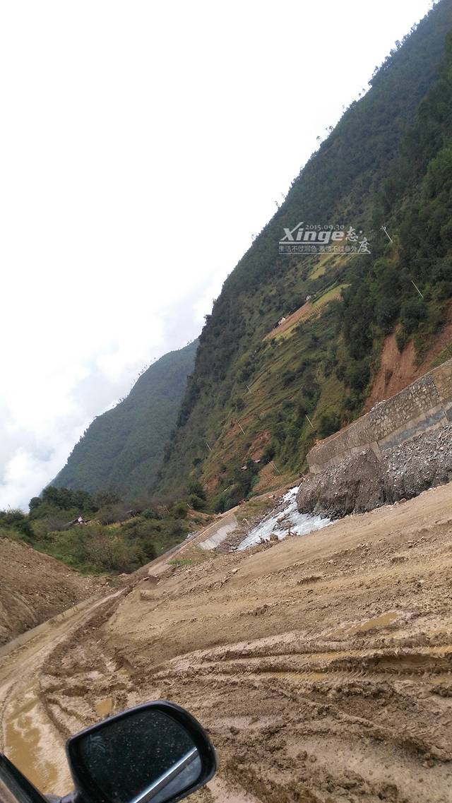 泥泞的道路让我再次感觉我的洪荒之力来了,各种急转弯,对,我就是喜欢这种奔在路上的感觉,在泥潭处的急转弯我大意一个猛打方向盘,整个车身向右倾倒的曲势,吓坏各位,飞雪来句不带这样玩的,我想说:我没在玩,路烂到这程度如果慢慢腾腾的,估计天黑都路不了多远,而且四处无人呀,除了施工队偶尔一二部车外,基本没人没车的,手机信号时有时无,导航自动失调毛线用都没,地图也没有标识,只能问路了。