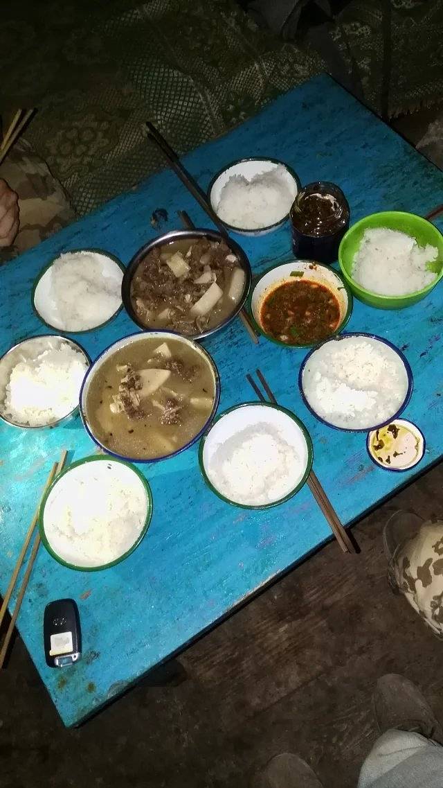 绝对新鲜的耗牛肉,米饭米饭米饭很珍贵的。主人家像招待贵宾一样的待我们几位,又是加柴烧火,为我们准备大床,一大家都围着炉子聊天,其乐融融,没有WIFI,没有信号,没有电,聊着聊着发现我们已经好多年没有这样安静的坐坐了,不是跟电子产品私聊,就是闹哄哄;星空很美,可惜拍照技术太水,加上疲劳也没谁有劲去拍了,吃完我们在楼顶感叹了许此,希望以后多有这样的机会大家都安静安静。