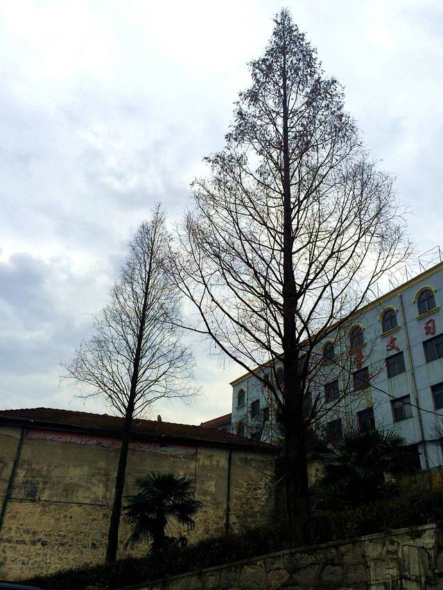 拐角处的落羽杉,在荒凉的冬景映衬下依然笔直耸立着,显示着顽强的生命力。
