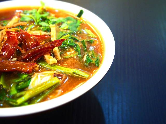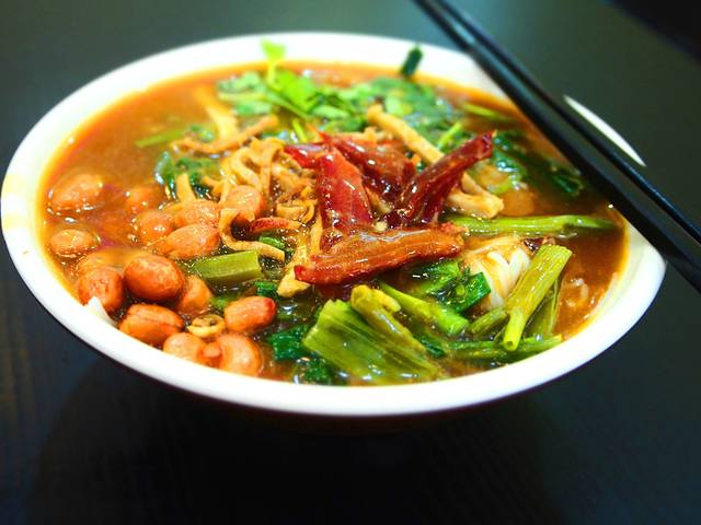这家店的酸粉味道比较好,汤汁咸淡适中,酸到恰好,配料丰富:酥脆的花生米、不会太硬的牛肉干、风干的鱿鱼丝、“海南粉类配料之王”鱼饼条(所有的粉里都有这玩意儿)、韭菜、空心菜梗、香菜,粉是最细的米粉丝,不管煮的多烂都有韧性,口感很好。啧啧啧,写到这里我已经不由自主地流口水了……对于爱吃辣的人来说,吃陵水酸粉的时候一定不能少了一样东西——“辣椒之王”海南黄灯笼辣椒!虽然海南人的饮食主体上比较清淡,但是人家吃起辣来也是不得了啊~加了黄辣椒的陵水酸粉简直好吃的不要不要的,那种酸中带辣的快感,是不吃辣的人无法体会到的美。陵水酸粉有一个独特的优点是其它粉类无法企及的,那就是无论是热的还是冷的,陵水酸粉的味道都很好,而其它粉类只能吃热的。