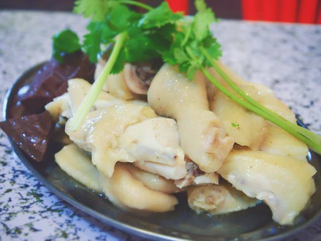 一般是鸡爪鸡翅膀鸡腿部位都有一些,还会配上一点儿配菜,像我这种只喜欢吃鸡腿的人就会要求老板娘多给一些腿肉。很是满足呢~