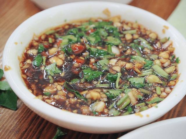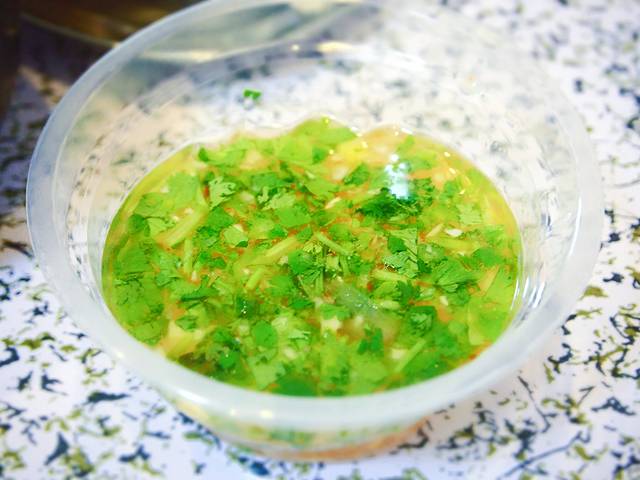 这是吃文昌鸡必不可少的蘸料,到底是怎么调好的,我不知道,但是这个料是吃文昌鸡的关键,如果只有一只嫩嫩的文昌鸡,你会觉得索然无味,配上这蘸料却是回味无穷。捣碎的蒜蓉香配上小金橘的酸,加上香菜的美味,还有一些我尝不出来的美味……总之,这蘸料才是文昌鸡的灵魂!