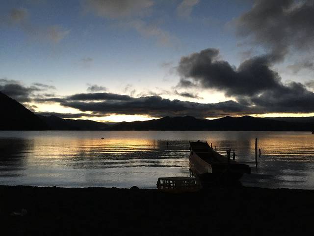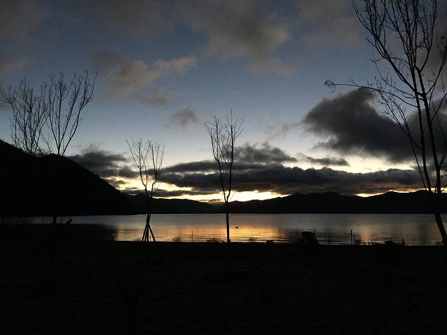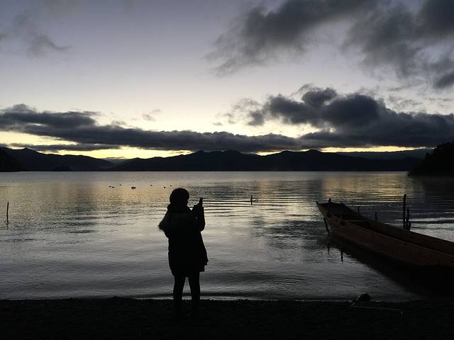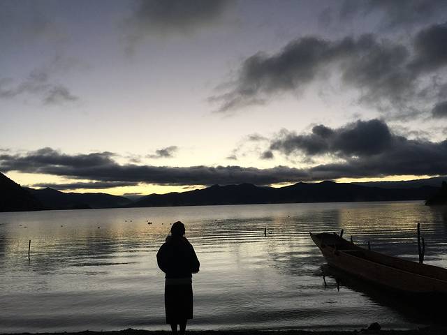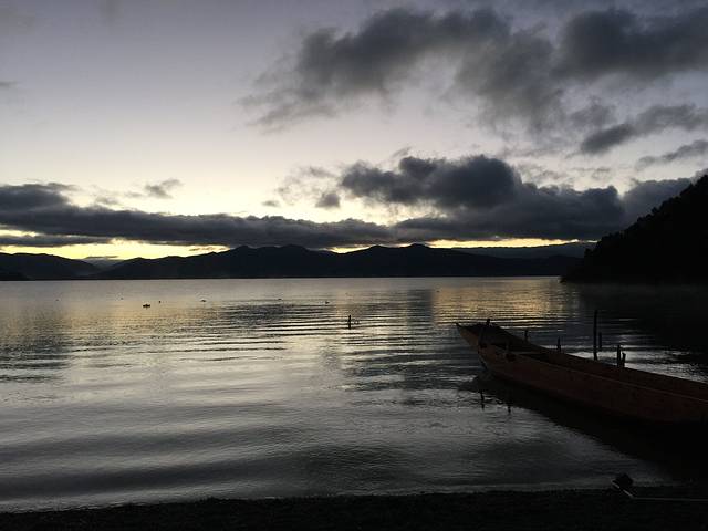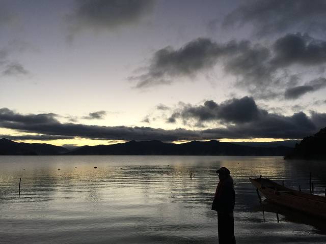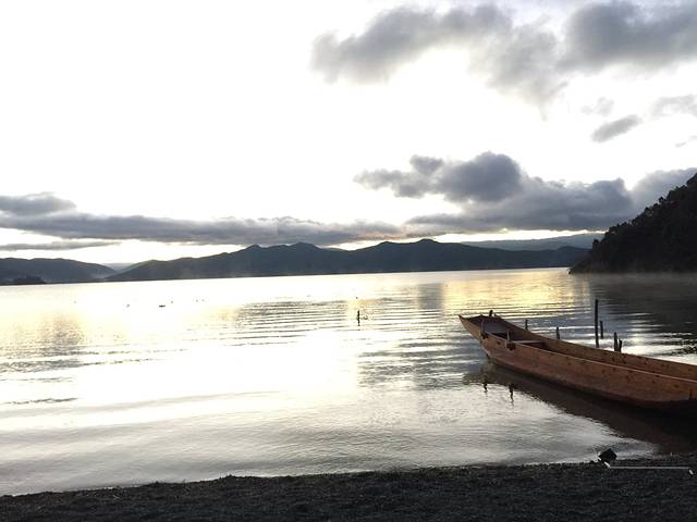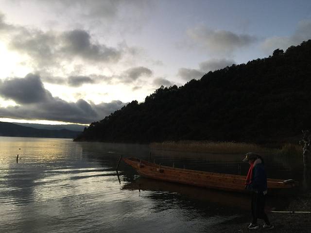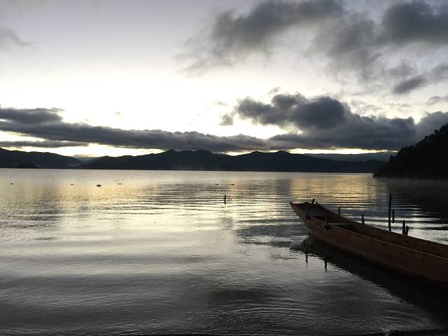 泸沽湖的第二天,已是早晨7点多,天还没有亮,远处的湖景美的像一幅水墨画,完全想象不出的色调,大自然的调色板果然神奇又美丽。据说这里的日出8点半以后才能看到,打开落地窗帘的那一刹那,震撼到了,看到这么美的湖面,不管多冷赶紧穿衣下楼,拍下这宁静唯美的湖面。。。8点吃完早餐准备出发了,路上得偿所愿看到了泸沽湖美丽的日出,有生之年第一次看日出,竟是那么美,那么神奇。一点一点射出的光,渲染了天和湖之间的缝隙,而后慢慢延伸,最美的天际线不过如此