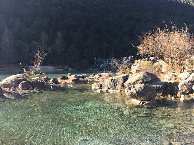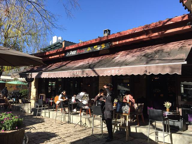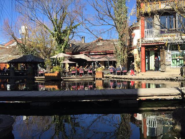 束河古镇才是一个来了便不想走的地方,临时起意多在丽江待一天,朋友推荐去束河看看,便驱车前往了,以为是千篇一律的古镇,惊喜的是它的小惬意和慢生活,相比丽江古镇,束河更安静、淳朴些,走在石铺路上特别舒服自在,石街下面是潺潺流水,流水里满是青苔,水面清澈见底,时不时的看见马匹拴在柱子上,阳光洒落下来,好慵懒的午后,此时只想找个地方晒晒太阳,喝喝茶,葛优躺。。。 不远处的吉他和歌声吸引了我们,中间像一个中央小广场,木筏制的路,只能两人同行的宽度,贯穿整个水面,水流边栽满了柳树,到处都是露天bar,这个地方,后来才知道叫“飞花触水”真的是好美的地方,似乎特别适合邂逅~~~ 湖对面就是吉他声的来源,一间酒吧——“小吧黎”,白天是露天咖啡厅,晚上是酒吧,人气不错,下午4点多的时候人就很多了,位子都很难找,幸好偶遇一帅哥,和我们拼桌,点了些甜品和茶,就这样闲聊听歌晒太阳,一下午,这才是生活该有的样子,时间应该浪费在美丽的时光,图片完全无法诠释这样的闲适与自在。这也是我此次旅行最悠哉的一个下午了。。。
