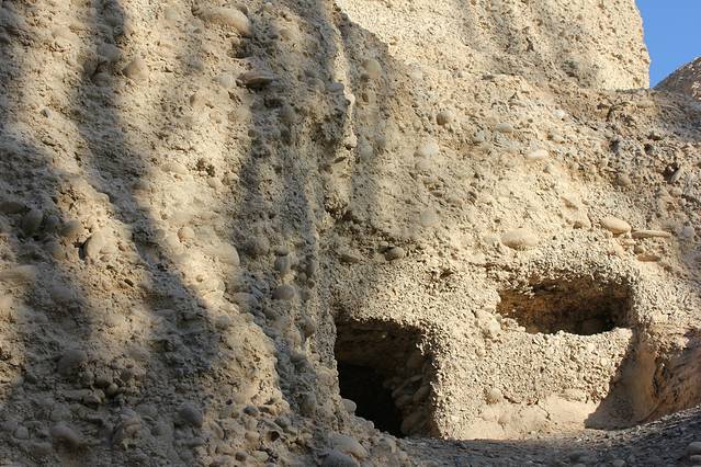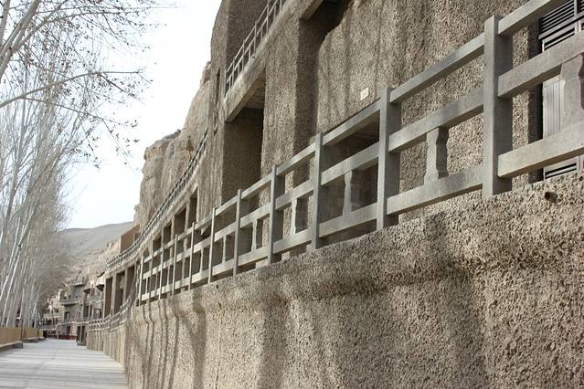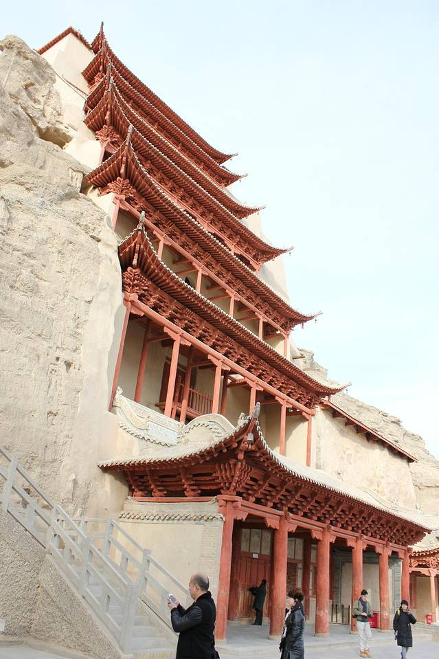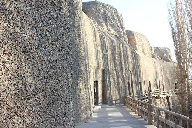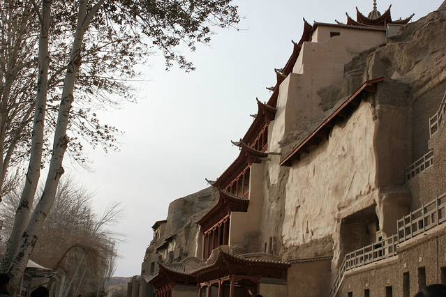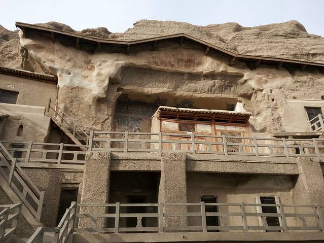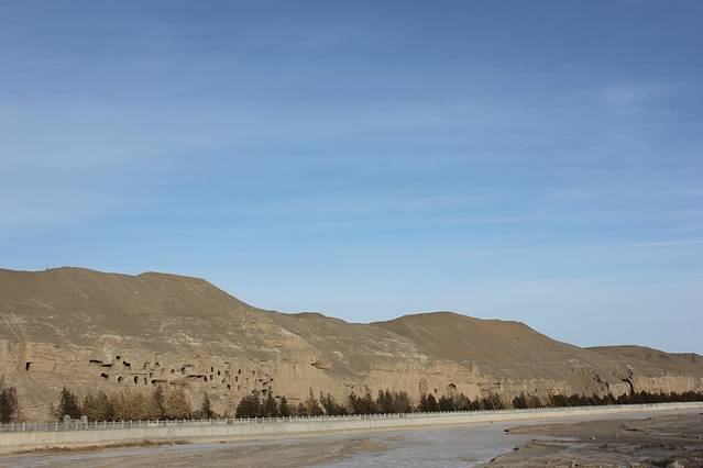 从数字中心有到洞窟的大巴摆渡车,坐满就走,这是路上拍下的,这些就是一些未开发的价值不大的石窟,还是很原始的,而开放的莫高窟现在外面人为修葺了一层保护罩似的墙,没了老气。