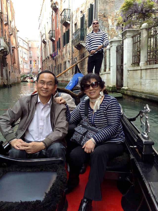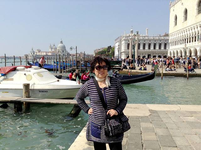 10点上了本岛,金晶首先带领大家到游船码头,乘坐威尼斯独具特色的尖舟“贡多拉”。这种轻盈纤细、造型别致的小舟一直是居住在泻湖 上的威尼斯人代步的工具,现在成了专用的游船。全团42人都参加了,分乘7只游船(每船限坐6人),我们和上海的两对老年夫妻同船。这种月牙形的黑色平底小船在街巷水道中穿梭,像自行车一样轻便灵活。我们的船工是一位意大利中年汉子,高高的个儿,快乐的神情,时不时的还吹吹口哨哼哼歌。船从门前过,人在桥下行。奇妙的街景,奇妙的感受,让我们切身领略了闻名于世的威尼斯水城独一无二的风光。不过,想到威尼斯因水而美也因水而危、有朝一日终将消逝的命运,人们在感受浪漫的同时也感受到丝丝凄美,默默祈祷这朵浪漫的水之花开得长久些、再长久些……