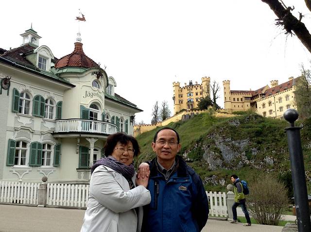 10点左右,大巴直奔德国富森的新天鹅堡。早晨我准备吃晕车药时被先生拦住,说今天上午路程不多,不用吃了。没想到出旅馆后一直开的是盘山路,绕来转去,不多久我就晕了,不仅胃翻要吐,而且腹痛要拉,浑身大汗淋漓。担心随时可能“出情况”,我又难受又着急,眼泪都快流出来……11:40,新天鹅堡终于到了,车一停下,我便直奔卫生间,解除险情……