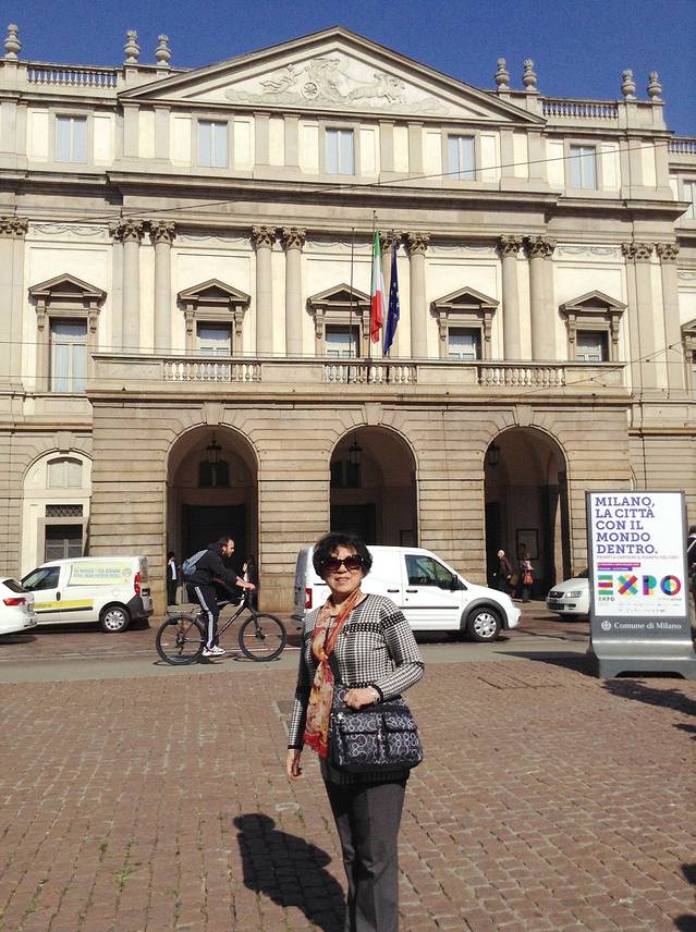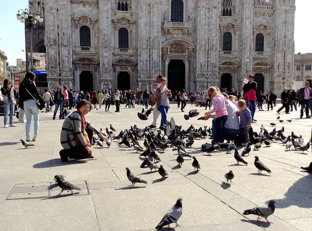 米兰大教堂是世界五大教堂 之一,规模居于第二位。它于公元1386年开工建造,1500年完成拱顶,1774年中央塔上的镀金圣母玛丽亚 雕像就位,1897年最后完工,历时五个世纪。它不仅是米兰的中心,也是米兰的象征。1805年,拿破仑 曾在这里举行加冕仪式。我们进入米兰大教堂参观,那些几层楼高的巨大的窗子上一块块描述不同故事的色彩斑斓的窗玻璃,和外观教堂顶上那数十个直插云天雕刻着精美圣像的尖柱一样,给人留下极其深刻的印象。我们在大教堂广场上呆了不少时间,人特多,有很多很多游客,也有很多兜售小纪念品的黑人和游来逛去的阿拉伯人。的确如导游所说,那些阿拉伯青年手里握着鸽子饲料 “不要钱、不要钱”地追着中国人送,我们牢记导游的叮嘱,摇摇头赶紧避开。广场上的鸽子可真多,大摇大摆地走来走去,自由自在地飞起飞落,如入无“人”之地。大家都感慨:意大利的鸽子真正享有“鸽权”了,要是在中国,这些可爱的肥嘟嘟的小家伙恐怕难逃被送进馋嘴的命运。