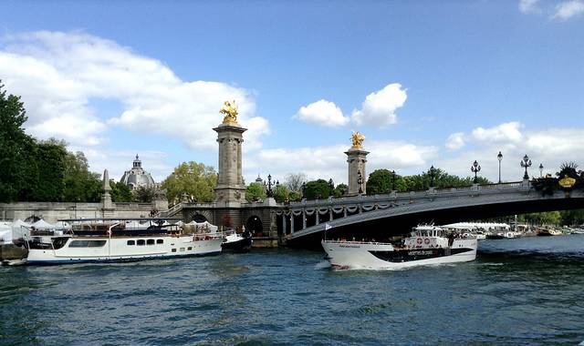 13:25,30位参加“塞纳河游船”自费项目的人驱车到游船码头,其余人被送往某个购物中心。13:50,我们排队登上游船。这是一艘比较豪华的游船,足足可容纳1000人以上。游船共两层,下层仓是密封的,上层则是露天开放的,甲板上摆满一排排天蓝色的靠背椅。捷足先登的游客毫不犹豫地来到露天层,先占上一个位子。我们已事先了解到游船是沿着塞纳河去而又回的,因此选择了前进方向的右舷,紧贴船边而坐,这里应该是特别有利于观景和拍照的。坐定座位举目四看,只能套用那句过时的网络语来形容:我和我的小伙伴们都惊呆了!两岸景致美不胜收,令人左顾右盼、眼花缭乱。塞纳河在巴黎自东向西,穿城而过。两岸楼房鳞次栉比,名胜古迹密布于河道两侧,有的建筑已经历了几百年的风雨,有的则是现代技术的杰作,体现了巴黎各个历史时期的不同建筑艺术 与风格。随着游船前行,卢浮宫、奥赛博物馆、巴黎圣母院、埃菲尔 铁塔……许多著名的巴黎名胜一一掠过眼帘,一座座各具特色的桥梁扑面而来。今天,恰逢一个晴朗少云的日子,蓝天白云,波光粼粼,迤逦风光尽收眼底。