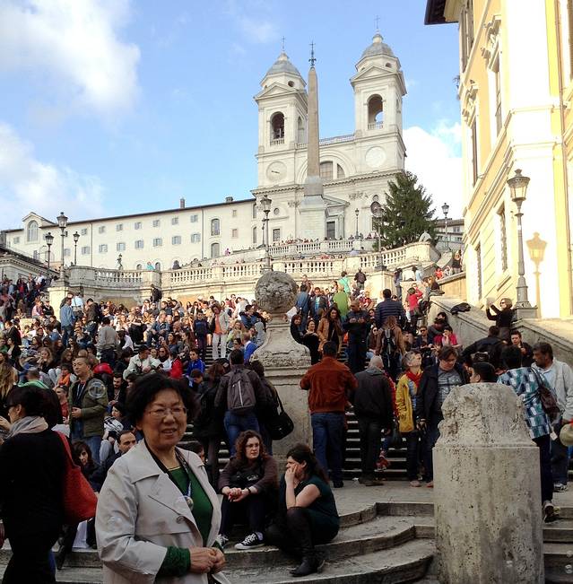 下一个景点——西班牙台阶,真正的走马观花,一级也没上,只是在台阶下走过路过看过而已。西班牙台阶是联接西班牙广场 的一座户外阶梯,花瓶型,138级,长与宽都居于全欧洲 之首,和许愿池一样,也因为曾是电影《罗马假日》 外景地而闻名遐迩。17:40-17:50,只有10来分钟,大家就站在台阶下傻傻地往上看,看台阶上面衬着蓝天浴着阳光的圣三一教堂的尖顶,看层层台阶上坐得满满、神情丰富的各国游客,想象着《罗马假日》 中的男女主人公在台阶上吃着冰激凌谈情说爱的浪漫情景,然后,不管三七二十一,啪啪啪啪照几张相,拜拜。