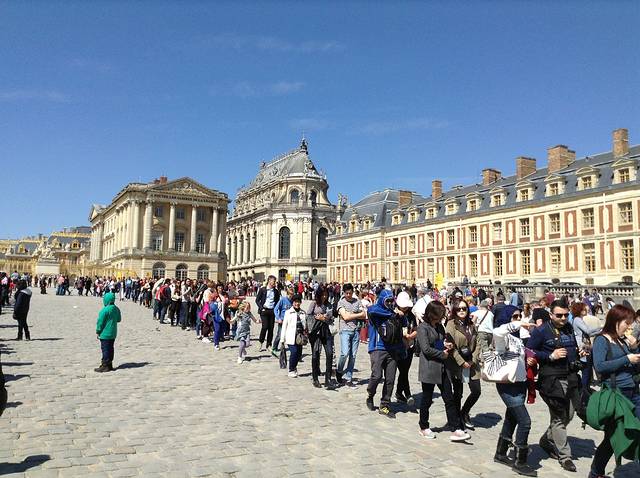 今日的凡尔赛宫已是举世闻名的游览胜地,各国游人络绎不绝,参观人数每年达二三百万。导游说那儿任何时候都要排长队,排一两个小时是正常的。我们来到宫门前,果见浩大的广场上队伍排得很长很长,绕来绕去,巨龙盘舞。我们顶着烈日排队50分钟,14:15进入宫内。发了汉语讲解器,十几个厅室,按键逐个讲解。室内装饰极其豪华富丽是凡尔赛宫的一大特色:内壁装饰以雕刻、巨幅油画及挂毯为主,配有17、18世纪造型超绝、工艺精湛的家具;宫内随处可见来自世界各地的珍贵艺术品,其中还有我国古代的精品瓷器。宫中最著名的大厅是镜厅,或叫镜廊。镜廊的一面是面向花园的17扇巨大落地玻璃窗,另一面是由483块镜子组成的巨大镜面。拱形天花板上是勒勃兰的巨幅油画,悬吊着24具巨大的波希米亚水晶吊灯,使人如临幻境……嚯,了不起的凡尔赛宫,令人震撼的凡尔赛宫,里里外外看过来,都是金碧辉煌、美轮美奂、奢华高贵、气势恢宏,用尽赞美之词也不为过!