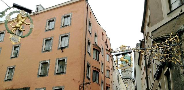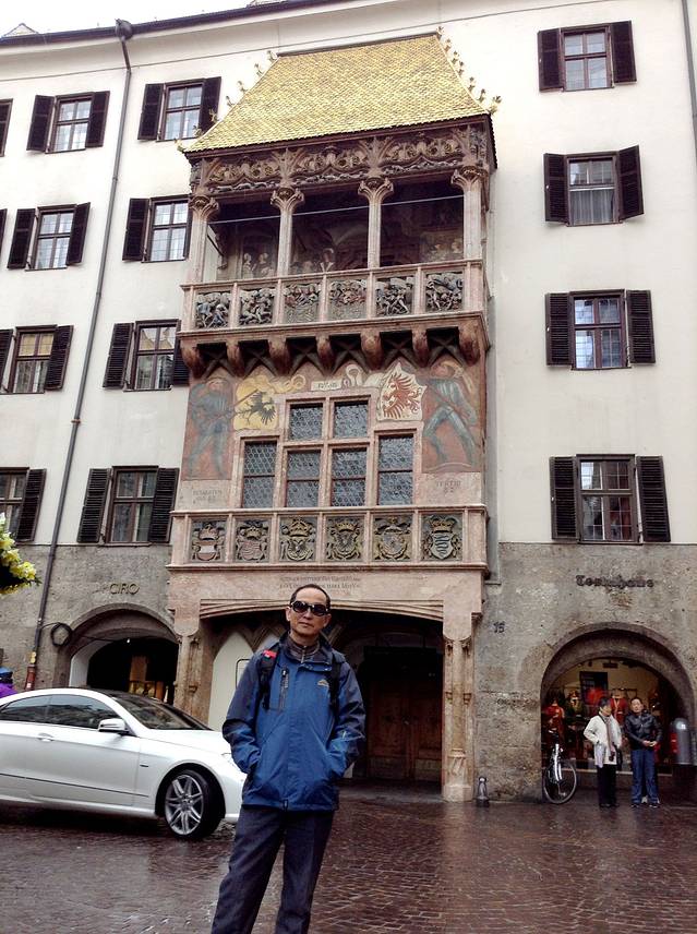 9:00,车入因斯布鲁克。首先去看这个地方唯一的景点“黄金屋顶”。黄金屋顶建于1500年,是为了纪念马克西米利安一世订婚而建造的。这个原本破旧的两层挑楼,被改建成为有哥特式穹隆的宫廷包厢,以便马克西米利安一世及其家眷在这里就能观赏到广场上的比赛和戏剧表演。鼎鼎大名的黄金屋顶并非全部用黄金打造,其高达3.7米的金色屋面乃采用3450块铜板芯金箔贴面而成。说实话,在我看来这个从前被人们称为新王宫的建筑显得简陋又小气,金屋顶则与整幢楼房格格不入,像卡其布工装上打了个金领结似的。