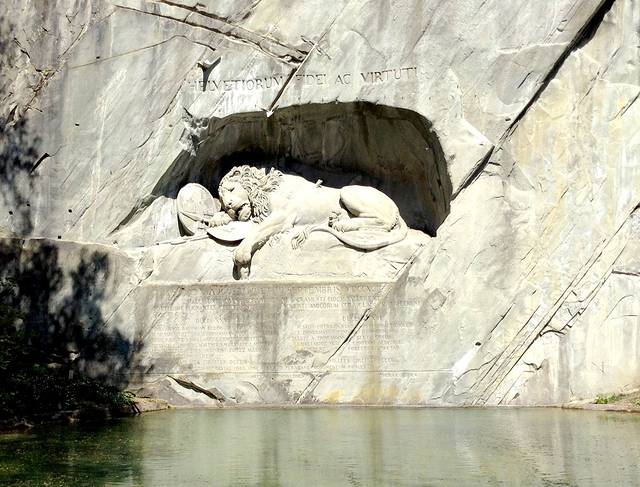 15:00,我们驱车去另一个景点:狮子纪念碑。这头濒死的石狮雕像是为纪念法国大革命时为保卫路易十六家族的安全而全部战死在法国的786名瑞士雇佣兵而建,雕像下方的文字描述了这一事件的经过。正是这一悲壮的事件为瑞士雇佣兵赢得了忠贞不渝的美名,梵蒂冈卫队一直由瑞士人组成,二百年来别无他选。这头濒死的雄狮被雕刻在亿万年前的冰川化石上,它肩插断矛倒地,表情痛苦万分,令观者动容。它因被马克•吐温誉为“世界上最悲壮最感人的雕像”而闻名世界,吸引着世界各地的游客前来拜访。