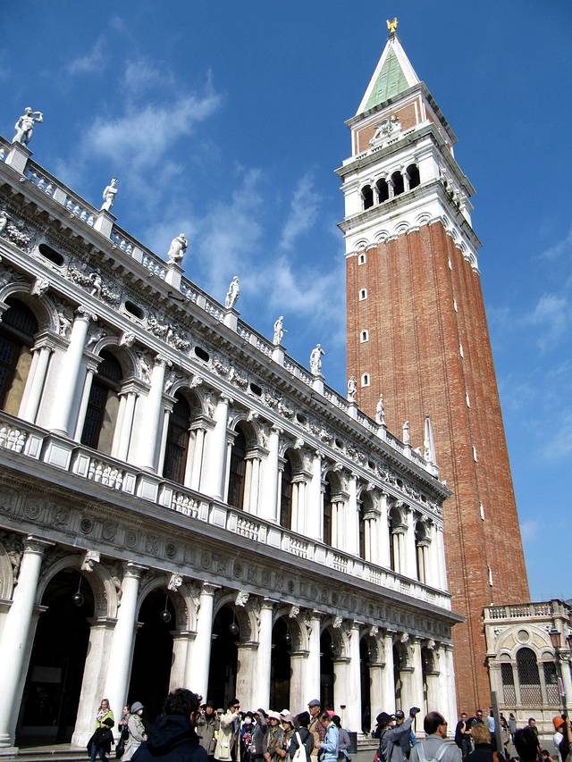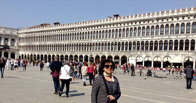 10:40,金导带领大家到达威尼斯城的主要景点、著名的名胜古迹圣马可广场。自古以来,圣马可广场一直是威尼斯的政治、文化、宗教 中心和传统节日 的公共活动中心。1797年拿破仑进占威尼斯后,赞叹圣马可广场是“世界上最美的广场”,因此曾下令把广场旁边的总督府改为行宫,至今人们还把它叫做拿破仑宫。圣马可广场是每年嘉年华 最主要的场景,平时它也像过节一般热闹,游人摩肩接踵,鸽子飞起飞落,一片欢乐和谐景象。