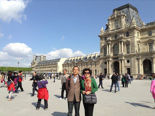 8:15,启程前往卢浮宫。法国城市老旧街道狭窄,道路两侧的停车都是首尾相抵,车与车之间咬得紧紧的,有的几乎看不到一丝空隙。据说停车难逼出了高难度的停车技术,驾车人停车时先寻找一处较大的空挡将车插进去,然后轻轻抵住前面或后面的车子(都不刹手刹),逼着它们缓缓前进或后退,最后将自己的车子硬塞了进去。这种停法我打破脑袋也是无法想象的。巴黎人喜欢坐在咖啡馆外面喝咖啡,看人也被人看。外来的女人脸上好像写了字,一定会有法国男人来搭讪。巴黎是时尚之都,男人女人都追求时尚,老奶奶出门也要化妆,牵着宠物狗闲逛更是数百年传承不息的时尚标志。再看巴黎大街小巷的建筑,都有200年以上的历史,是拿破仑时代城市大改造的产物。它们最高不超过6层,用法国大白石建造,大白石石材是从巴黎地下挖出的,房子的墙壁厚达80公分,很紧固。这些建筑风格一致,房子里冬暖夏凉,不用安装空调。最明显的表现是只在二层或三层建有别致美观的阳台,称为奥斯曼阳台,又名贵族阳台。阳台上统一摆放着花盆,盆中花繁叶茂、色彩斑斓,仿佛墙壁上镶嵌着一幅幅水彩画,非常典雅漂亮。为了保持巴黎的古风古韵,政府规定一般不得对房屋外观进行改造,哪怕很小的改造也要上报获批才行,内装则没有约束,可以自行其是。