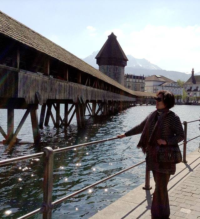 我们在琉森湖边的天鹅广场分散,自由活动,3小时后再回到原处集合。瑞士表是瑞士的标志与象征,这里表店特多。因为这次没有购买瑞士表的任务,我们选择先赏风景后逛商店。时间很充裕,我和先生单溜,沿着琉森湖边一直走过去,陶醉在美景之中。一边是优美宁静的画面:蓝天上飘着白云,碧水中浮着天鹅;碧水映着蓝天,天鹅似白云朵朵;天水之间连绵起伏的雪山,像一条洁白的丝带隐隐舞动……一边是繁华闲适的街景:马路边各具特色的建筑鳞次栉比;马路上高档轿车悠然穿梭;宽大的林荫道上绿树葱茏;林中的木靠椅上、沿湖的石阶上,坐满了老人、孩子、情侣、游客,人人脸上写着悠闲与惬意……天上人间绝美处,“人在画中行”!