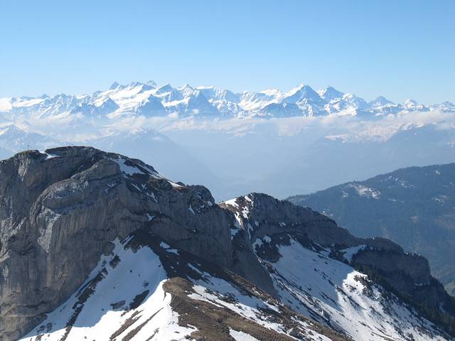 皮拉图斯山是琉森的门户和地标,琉森有皮拉图斯大街和皮拉图斯电台,可见其重要性。它以拥有世界最陡的登山列车和“皮拉图斯山金色环游”项目而成为世界级的景点。遗憾的是我们这次无缘搭乘那辆缓慢地在世界上最陡峭(48°)的山壁齿轮铁道爬升的登山列车,也没有安排什么金色环游项目,所以对它没留下特别强烈的印象。我们先坐4个人的小缆车,到中途下来转登可容二三十人的大缆车,直达皮拉图斯山顶观景台。在这里远眺观赏云雾缭绕的连绵雪峰,很漂亮。时间多,许多人去攀爬观景台旁边的峰峦,我们没爬。花90欧登上阿尔卑斯山脉的重要雪山之一,还是值得的。今天的缺憾是皮峰本身几乎无雪,所以近观景致平常,加上天冷风大,室外不可久留,长时间窝在休息室内就没啥意思了。11:20结束,再坐大缆车转小缆车下山。