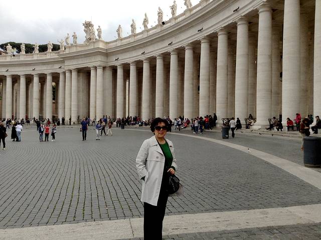 饭店老板娘李天娜兼任罗马地导,她说她的名字好记,就是中国人遇事特喜欢说的两个字——“天哪!”她把我们团42人分成两拨,一拨13人是报了“罗马深度游”自费项目的,每人发一个中文讲解器,可以在此后的深度游中听取她的介绍,还另外赠送了当下的梵蒂冈中文讲解;另一拨则只能跟在后面,什么都听不到,成了“二等公民”。呵呵,出门旅游该花的钱不能省,花钱不花钱待遇就是不一样,立竿见影。