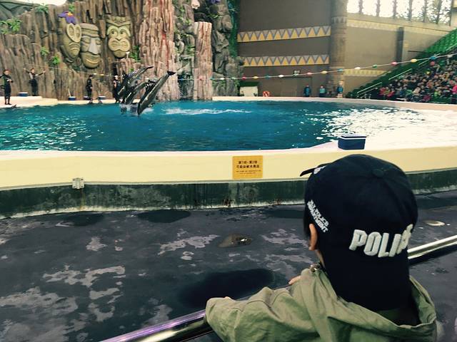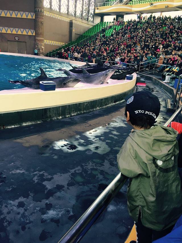 海豚表演要开始了,大屏幕滚动可以看到台下的观众