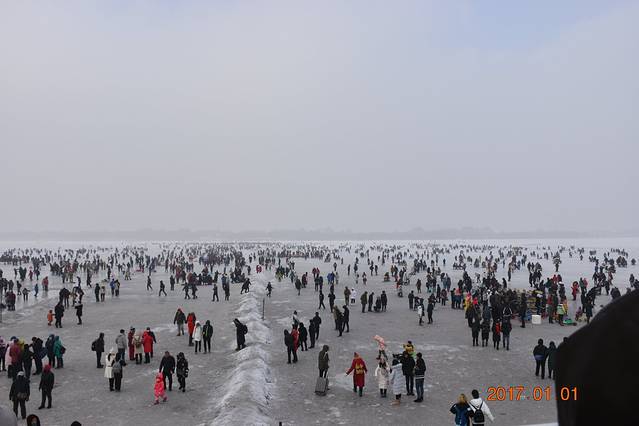 在中央大街逛逛了,走到头是松花江,冬天江上都结冰了,好多人在江面上玩耍。可以横跨松花江到太阳岛,看着不远。