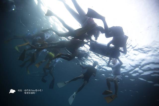 第一天的第二潜是蓝角,从下水开始就不顺利,因为有另一艘船要停靠到我们穿所在的位置,船长一直催促我们赶紧下水,整个下水过程慌慌张张,人到水面还没完全准备好,主潜导就要求我们开始下降,因为流大,我们需要排成队抓住绑浮球的绳索一一下潜。从放开绳子开始停止下潜,跟着主潜导的方向前进,这时候我发现我开始在顶流移动,身边也开始有鲨鱼游过,当时还在想,哦,原来顶流是这样的感觉啊,好累哦,多耗气啊,我已经明显感觉到我需要很多气来支撑我踢腿,一边使劲踢腿,一边还在找周围鲨鱼。在我越来越力不从心时,发现郭生离我越来越远,在前面带路的主潜导也看不见了,这下我有点着急,立马转头找后面断尾的潜导Morris。幸好他一直在我后面,他也发现我状态很不对劲,立马抓住我的BC一起移动,此时,我们应该是在流最大的地方,只能靠抓着峭壁的石头移动。这个时候,我们和主潜导还有郭生他们已经彻底走散。在抓着峭壁移动一段后,Morris发现继续这么顶流不是办法,根本没可能有足够的力气和气支撑我们按原计划顶流找主潜导跟他们汇合,只能中断这次潜水先上水。跟着Morris的整个过程,我都在担心郭生,他有没有跟上前面的潜导,他会不会因为担心我着急而出事。我整个过程一直在对自己说,我一定不能慌张,要信任潜导,先照顾好自己,上课时,郭生一再跟我强调潜水最怕的就是慌。终于安全回到船上,Morris告诉我,如果我们当时再不上水,就有可能被冲到外海喂鲨鱼,好惊险。又等了几分钟,终于看到郭生他们也安全出海。上船后,郭生告诉我,我走失后他那儿也很惊险。他在发现我不见时,同时也看不见主潜导的影子,只能看见前面像是转角的地方有一串串的泡泡,他立马用力踢过去找人。此时流大到连蛙鞋都踢掉,这在郭生这么多年的潜水生涯中还是第一次遇到,当机立断先去追蛙鞋,因为没有蛙鞋就没有动力踢流。幸好,幸好,我们都安全回到船上。