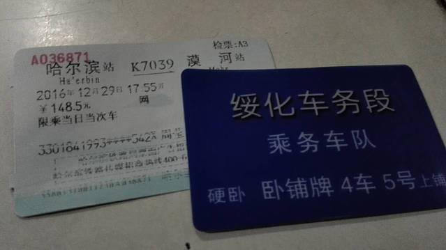 (今年去哈尔滨到漠河一天只有一班火车K7039,票是12306官网一开售就抢了的,竞争还是很激烈的。去漠河的时候因为想看下沿路的风景,我坐了硬座,车厢里的驴友都说抢不到硬卧。火车去漠河要14H左右,回哈尔滨16H左右。若是对火车也没什么情怀的,也可以选择坐飞机,就是机票旺季可能会炒到单程2000+这样。)