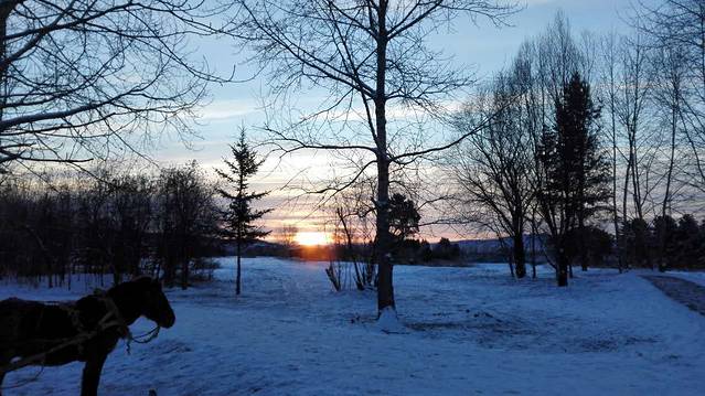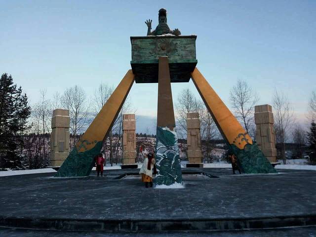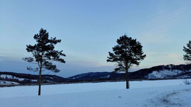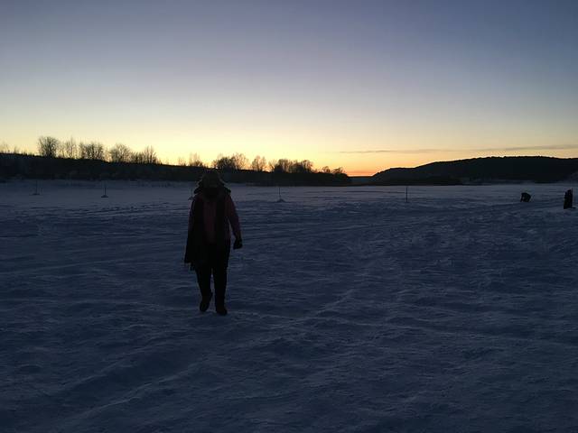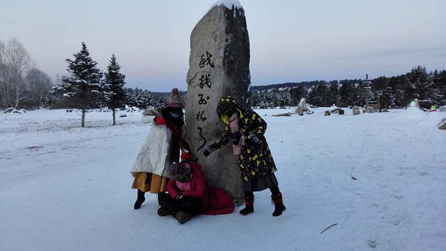 日出之前的北极村是暖宝宝大棉袄也救不了我们的,坐在马拉雪橇上半小时就白了头,睫毛也结了薄薄的一层冰。图片是我走了一会儿路逼着君君硬拍留念的,可能冰都掉了,看不大明显,后面有雪橇师傅的照片,那冰才叫实在。