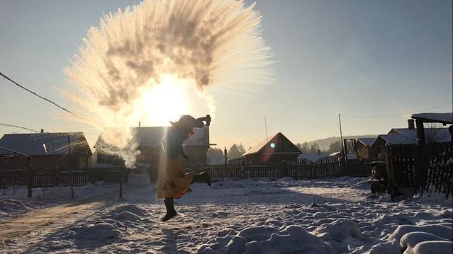 泼水结冰几乎是漠河最受驴友欢迎的低成本项目了。也没什么技巧,就准备一杯热水,洒向天空就行了。我们仨行程太紧,下午就坐火车回哈尔滨了,所以就洒了一次,随便拍了一下,美的不大明显,大家可以去网上搜图,张张惊艳!